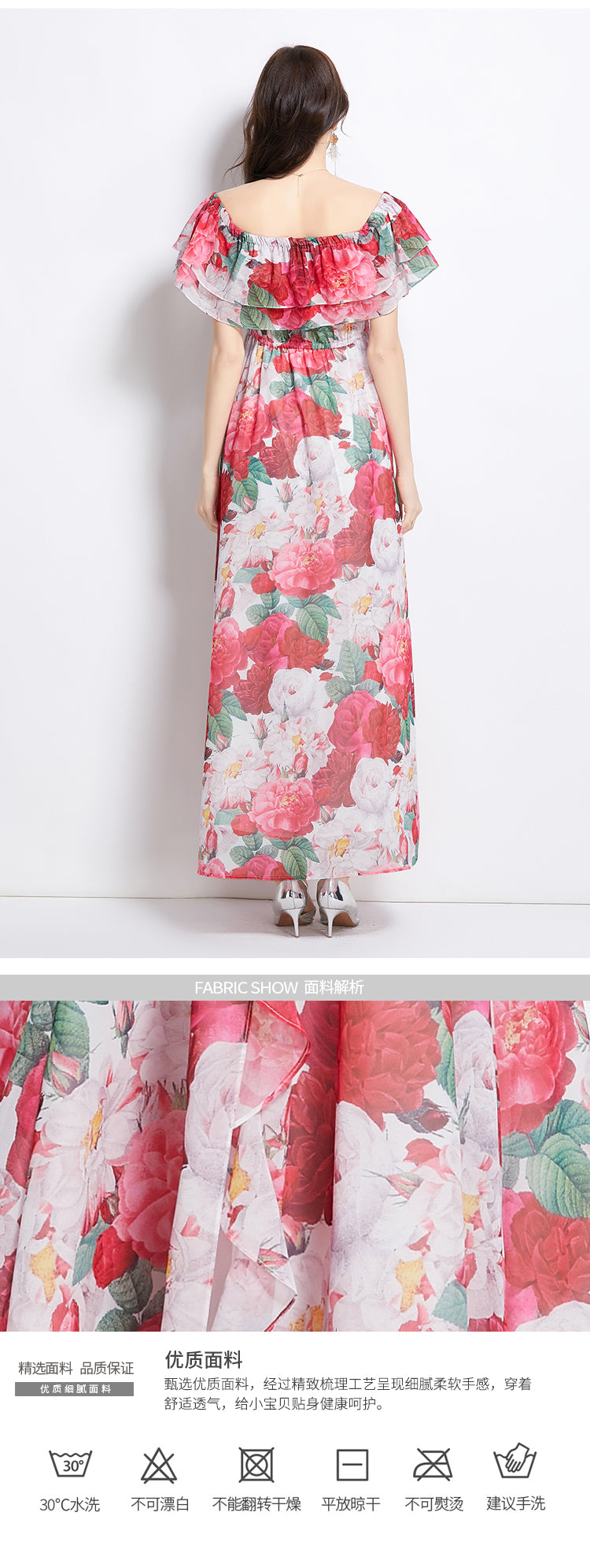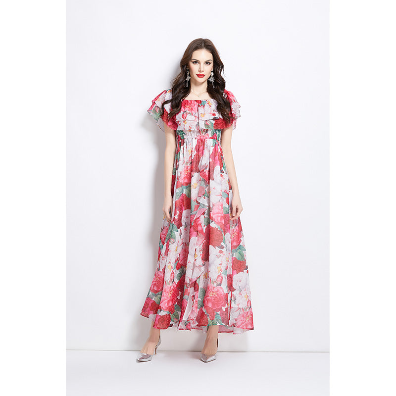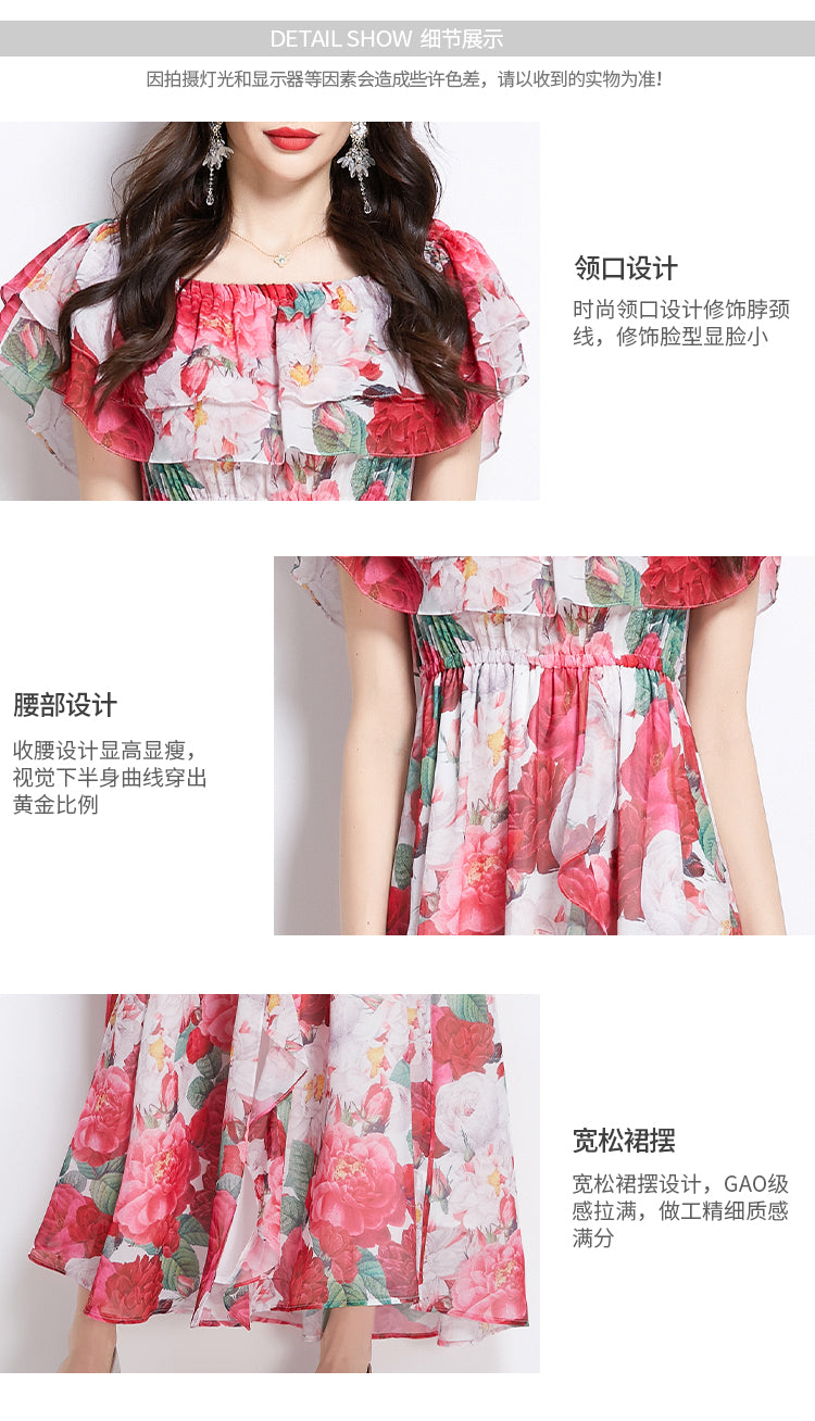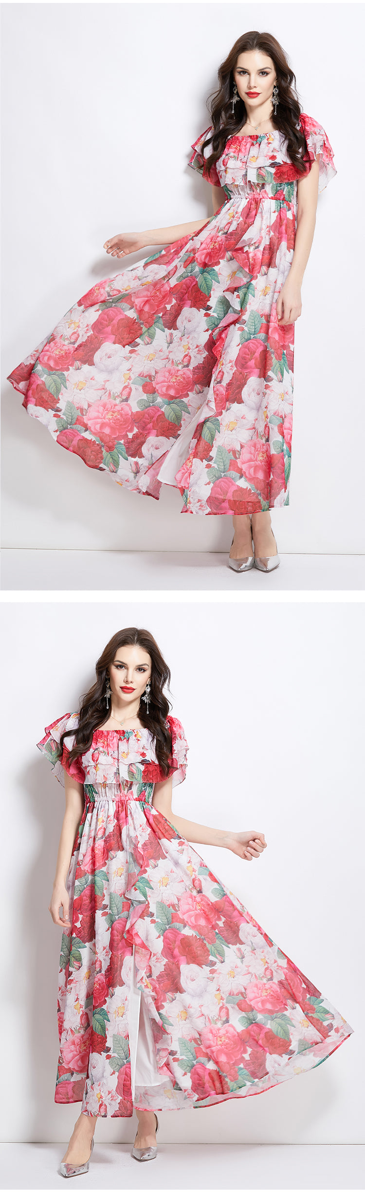 Original design for spring and summer ruffle edge one piece collar, waist cinched, big swing beach skirt, split chiffon dress