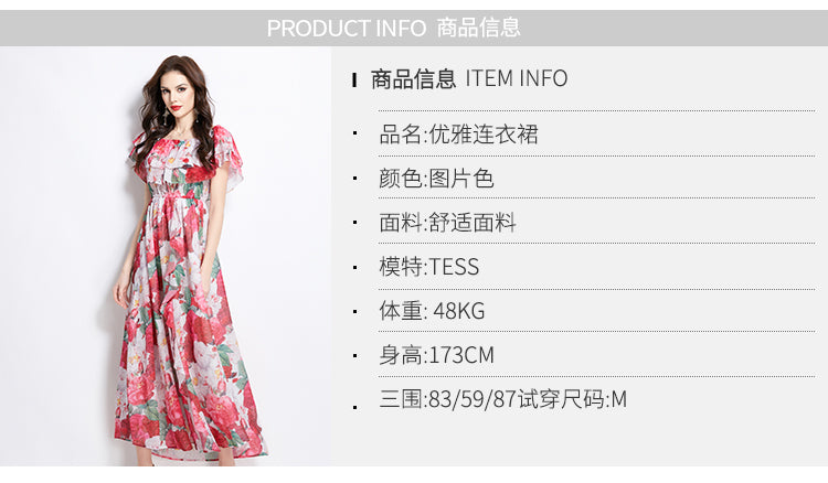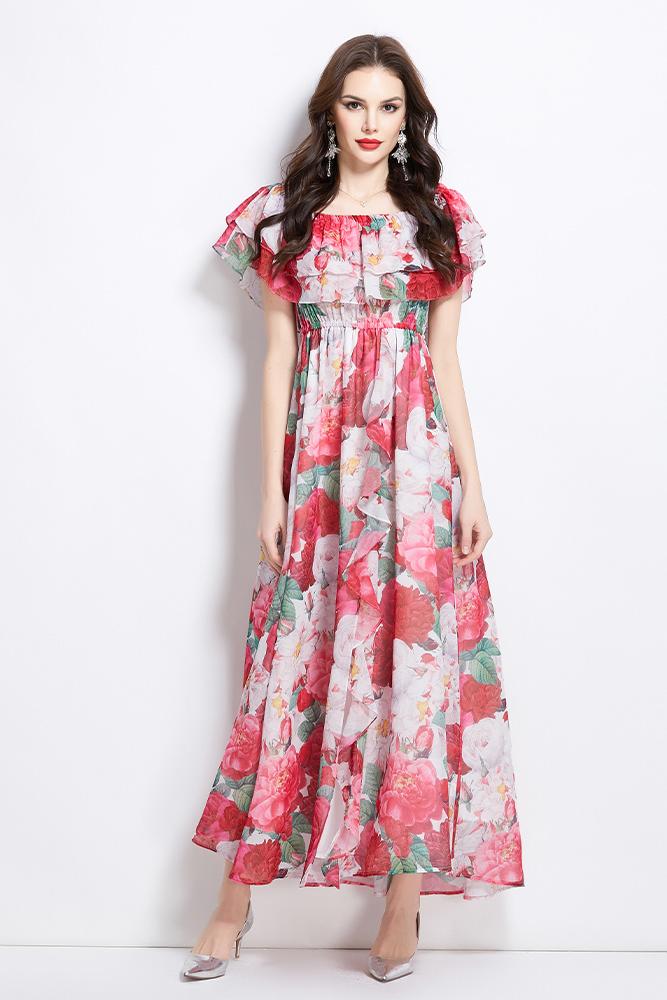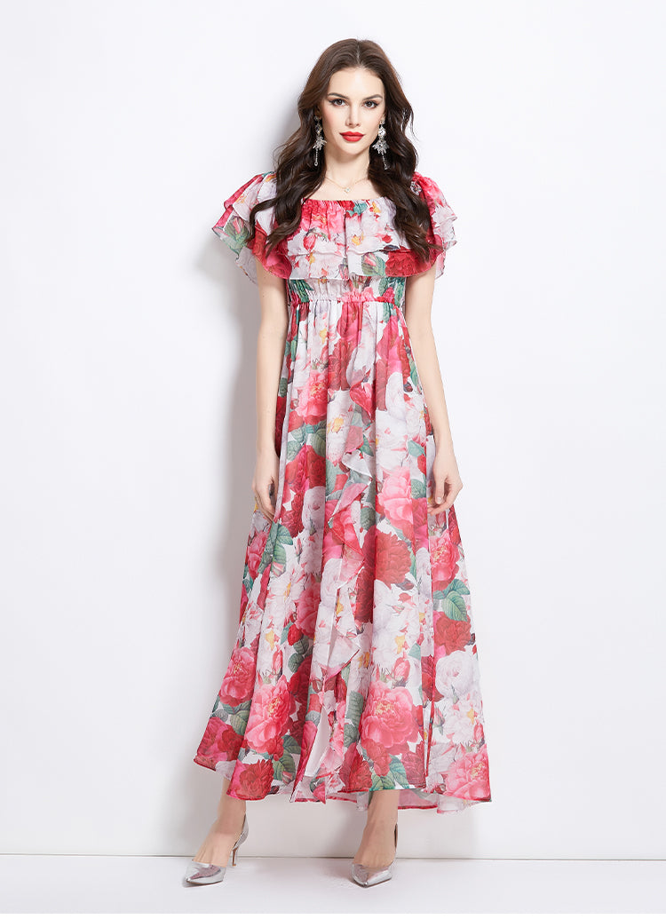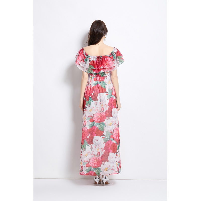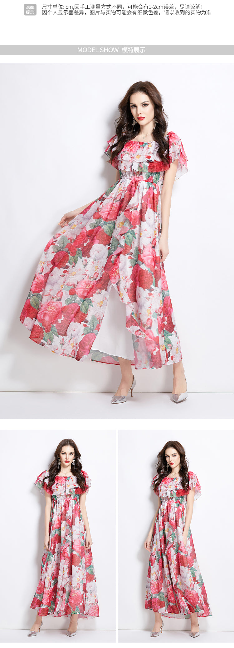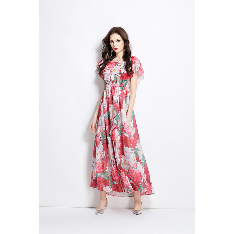 Original design for spring and summer ruffle edge one piece collar, waist cinched, big swing beach skirt, split chiffon dress