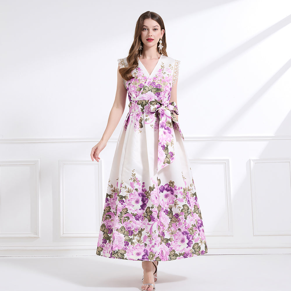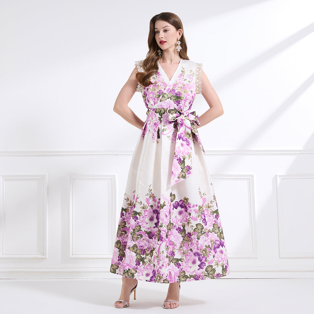 Original design - spring, summer and autumn fake wind, small flying sleeves, flower fairy print, seaside waist ruffle tie long skirt